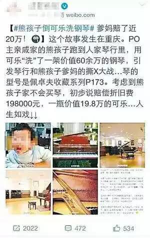 还记得这则新闻吗?一个熊孩子拿水往亲戚的钢琴键上倒,孩子爹妈以“哎呀,小孩子不懂事”推脱,还反说这是孩子“好心帮忙洗琴”。亲戚不好发火,于是笑眯眯夸熊孩子干得好——后来熊孩子再接再厉,在商场用可乐“洗”了一架60多万的进口钢琴,被索赔19.8万折旧费。