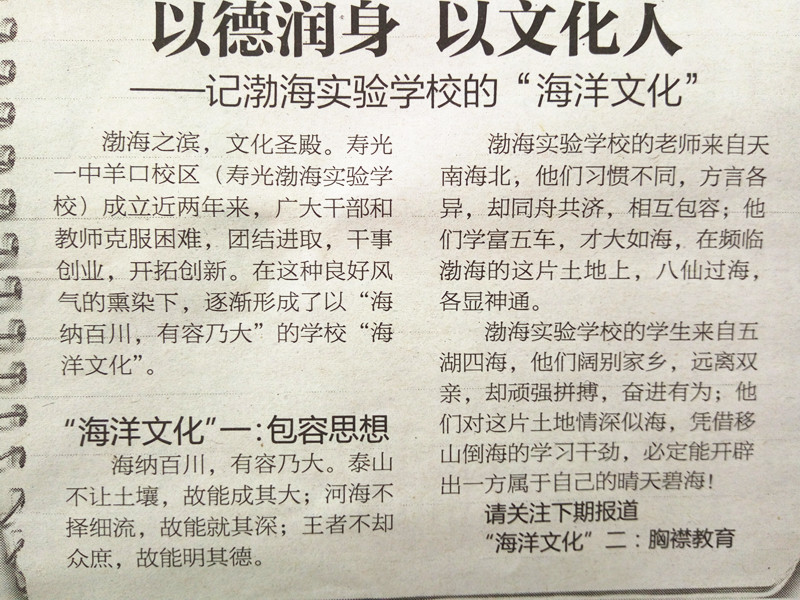自寿光渤海实验学校成立以来,坚持特色办校、“文化立校”,付成波校长倡导的“海洋文化”在全校渐成风气,逐步渗透到了全校师生的日常管理和教育教学中。寿光日报从3月28日总第5788期开始,在A7成长版连载刊登我校海洋文化,望老师们可以多加关注。