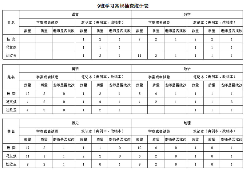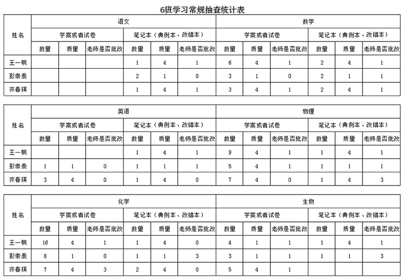 为了准确把握高一学生学习中必备的各项学习常规的整理和使用情况,年级从1-12班抽查了3、11、21号三位同学,13、14班1-10号十位同学的学案或试卷、作业本、典例本、改错本等。经过检查发现,班级与班级之间差距很大,同一班级同学之间差距很大,不同学科之间差距很大。通过本次检查,借以督促学生们在以后的学习中更加重视学习常规的整理和使用,在规范化的学习中不断提升能力和水平,促进更好的发展。