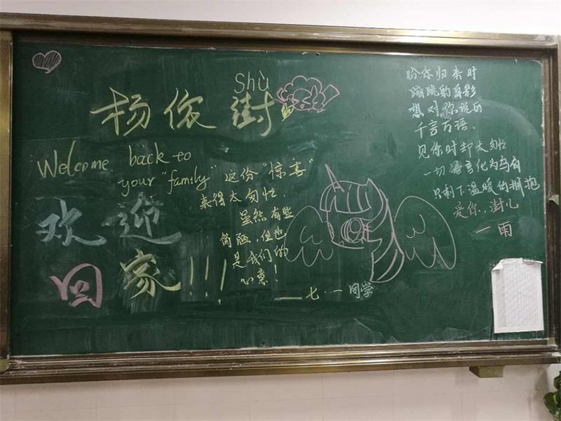 近日,寿光市渤海实验学校初中部七年级一班教室内举行了一场别开生面的欢迎仪式。大家心怀激动,脸露欢喜,出板报,点音乐,热烈庆祝康复返校的杨依澍同学。