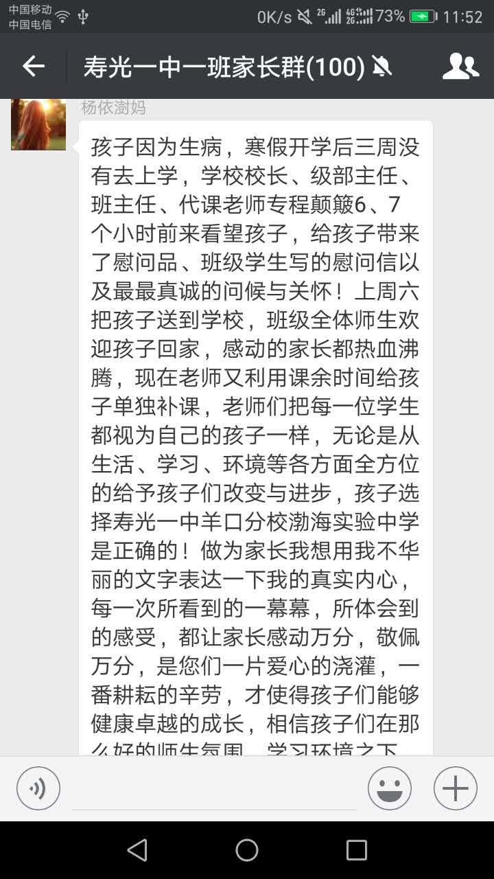 学生生病,领导、老师牵肠挂肚,甚至不远千里到学生家去探望,这可不是一般的感情。师者怀圣德,不是口号,顺德而为,做出来才是真的有德。这样的学校,家长放心,学生安心。