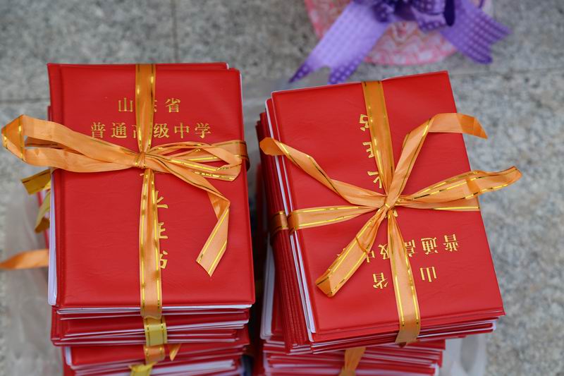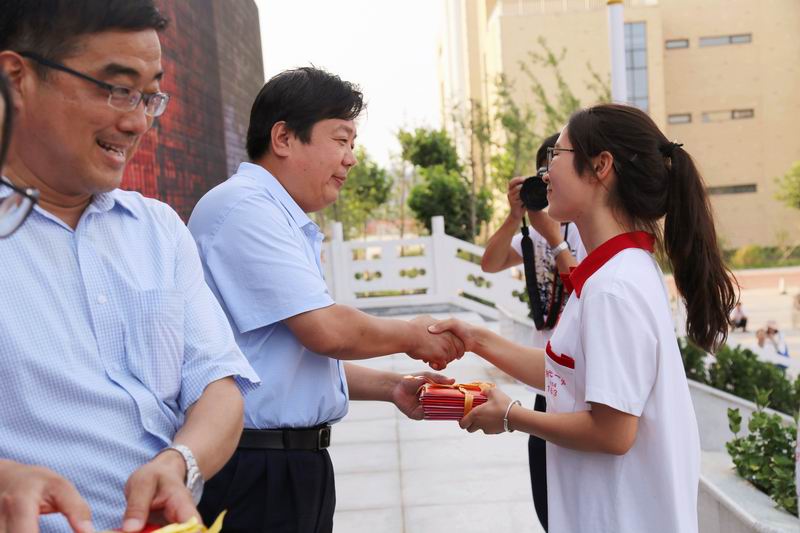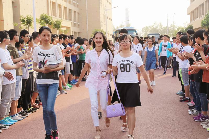 付成波校长和张福林副校长为同学们颁发了毕业证书。当学生代表从校长手中郑重地接过毕业证书时,同学们掌声雷动,欢呼雀跃。紧接着,2014级优秀学生代表将自己的学习资料和笔记赠送给了学校,存入校史馆,并将代表着拼搏、奋斗精神的高考之旗传递给了2015级部学生代表。至此,毕业典礼结束。全体老师和同学自动到和谐楼广场南路两侧列队,欢送我校第一届校友。