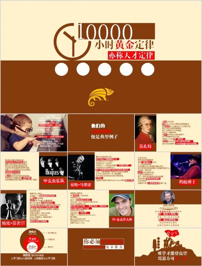 (8)音乐神童莫扎特,在6岁生日之前,他音乐家的父亲已经指导他练习了3500个小时。到他21岁写出最脍炙人口的第九号协奏曲时,可想而知他已经练习了多少小时。象棋神童鲍比·菲舍尔,17岁就奇迹般奠定了大师地位,但在这之前他也投入了10年时间的艰苦训练。