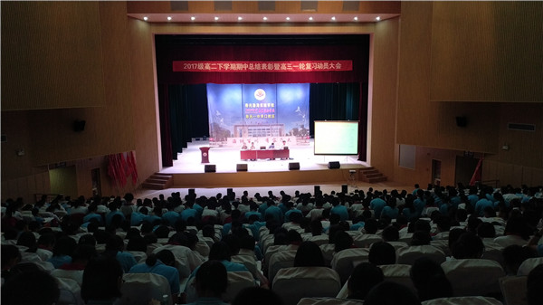 5月22日,2017级在学校艺体中心召开期中考试表彰暨迎高三一轮复习备考动员大会。大会共四项内容。