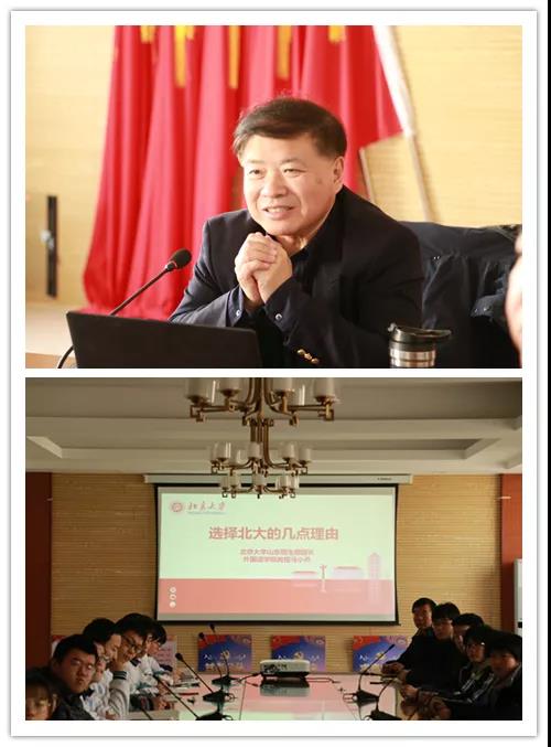 马小兵教授首先代表北大对寿光渤海实验学校的毕业生在北大的优异表现向学校表示衷心感谢,感谢渤海实验学校的悉心培养,为北大输送了优秀人才;然后向在座的师生介绍了北大的办学特色,近几年北大在山东的招生情况,以及北京大学本科培养特色、优生培养等,特别是百位为改革开放做出重大贡献者中,北京大学有11位教师和校友上榜,2019年新当选的院士当中,北大有7人入选;马小兵教授以此鼓励学子们要树立远大志向,向榜样学习,在不远的将来为共和国建设贡献自己的力量!