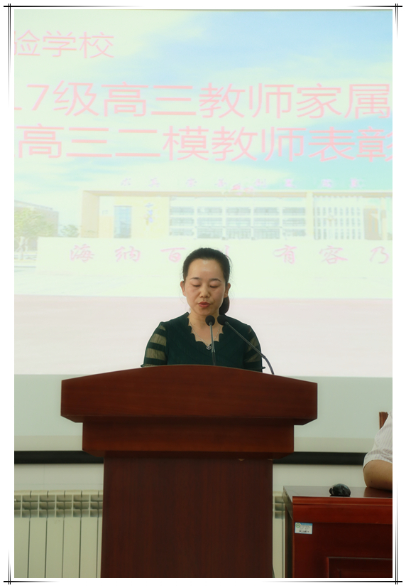 教师家属代表林玉清上台发言,林玉清老师首先感谢学校的盛情邀请,向高三教师的辛苦付出致敬,表示将会一如既往的将家庭照料好,免除高三老师的后顾之忧,相信凭借高三教师的精诚团结与拼搏努力,一定能够实现高考新胜利!
