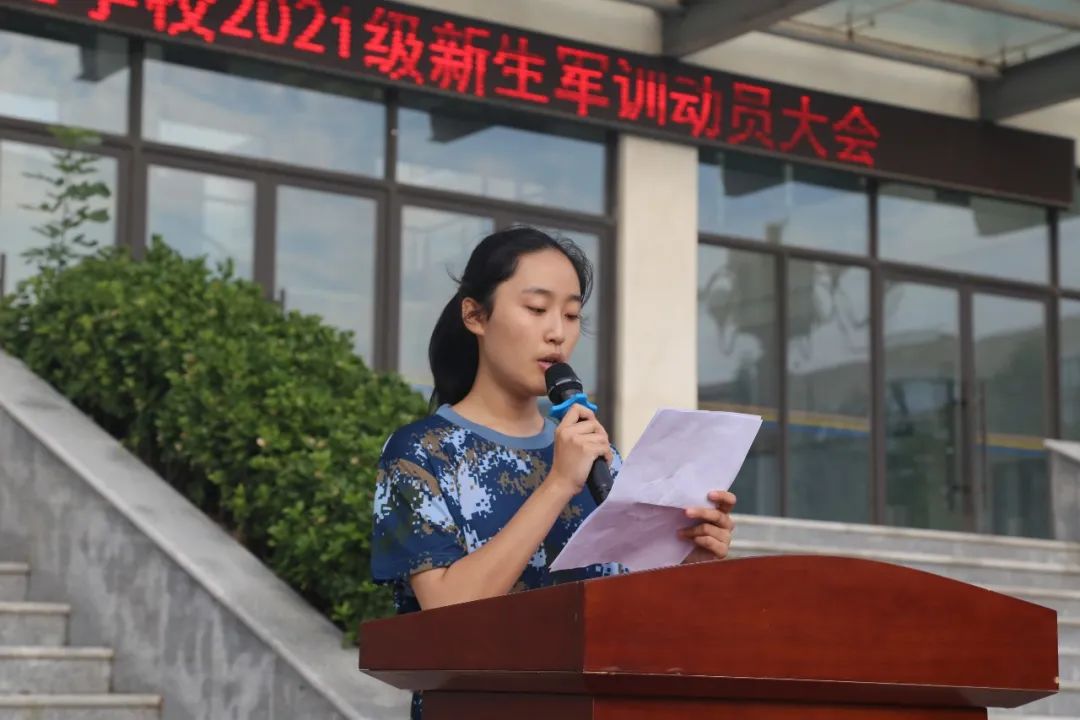 学生代表杨茜雅同学代表全体参训学生,发出了新挑战的呐喊,军训虽然辛苦,但是能够培养广大学子的爱国精神和国防理念,赋予同学们坚强的意志和顽强拼搏的勇气,能够在未来的学习生活中有足够的信心去接受挑战。杨茜雅同学表示,新高一的全体学子将以最激昂的态度面对军训,听从教官的指挥,不怕吃苦,不怕劳累,绝不轻言放弃,一定能够在本次军训中养成良好习惯并延续到今后的学习生活中。