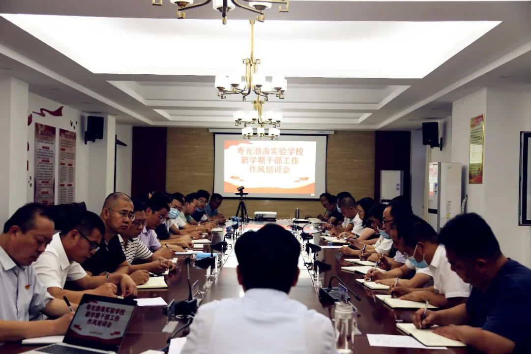 进一步提升学校的管理品位和办学品质,提高学校干部的管理能力,着力打造一支作风过硬、独当一面、效能卓越,适应新时代教育的学校管理团队, 9月5日晚,在学校党员活动室,寿光渤海实验学校召开全体中层干部培训工作会议,会议由王成忠副校长主持,学校党支部书记,校长梁本江同志作“转作风、明责任、提标准,在高起点上迈入发展快车道”为主题的报告,对领导干部作风与能力建设提出明确要求。