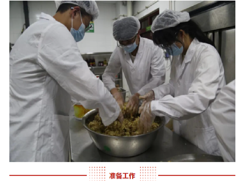 活动开始前,餐厅的师傅们为师生事先准备好了包饺子的工具、面团、荤素饺子馅,各班派出代表到餐厅后厨跟随师傅们学习调馅、揉面、擀皮、捏皮等系列步骤。