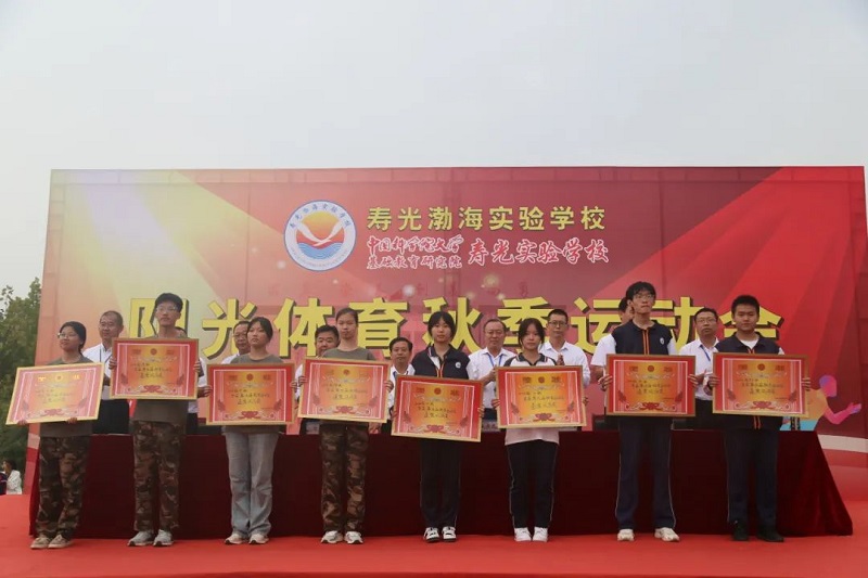 鹰击长空,鱼翔浅底,万类霜天竞自由。9月26日,我校迎来了第九届金秋体育艺术节。学校党支部书记、校长梁本江携学校领导班子出席了开幕式,支部委员徐涛主持开幕式,梁校长致开幕词。 在激昂的鼓号声中,运动会拉开序幕。本届运动会的主题是“阳光体育,健康成长”。在五星红旗的引领下,伴随着热情洋溢的《运动员进行曲》,国旗队、鼓乐队、花束队、彩旗队、裁判员代表队、教职工代表队、运动员代表队身着统一服装,迈着整齐的步伐经过主席台。方阵队员们精神饱满,步调一致,口号响亮,展示了寿光渤海实验学校坚韧不拔、顽强拼搏的精神风貌。 全体起立,奏唱国歌。伴随着激昂雄壮的国歌声,国旗队英姿飒爽地擎着鲜艳的五星红旗,五星红旗在秋日的阳光里熠熠生辉,全体师生起立合唱国歌。 庄严的升国旗仪式后,梁本江校长致开幕词。梁本江校长首先代表大会组委会向筹备本次运动会的同志表示衷心的感谢,向全体师生表示亲切的慰问,向参与运动会的运动员、裁判表示良好的祝愿。他表示,寿光渤海实验学校始终秉承“以人为本,健康第一”的理念,积极响应“我运动,我健康,我参与,我快乐”的号召,深入推进体育项目,也希望同学们积极投身体育运动。 为了确保运动会的顺利进行,梁校长提出了三点要求:一是希望全体运动员遵守比赛规则,公平竞赛,赛出友谊,赛出成绩;二是希望全体裁判员、工作人员遵守裁判规则,公正裁判,热情服务,准时到位;三是希望全体同学遵守会场纪律,服从指挥,文明观赛,爱护环境。最后,梁校长对参与运动会的全体师生表达了自己的期望,并预祝全体运动员取得佳绩,预祝本届运动会圆满成功。 铿锵有力宣誓言,全力以赴彰精神。运动员、裁判员代表先后宣誓,表示将以积极饱满的态度、认真负责的精神对待本次运动会,致力打造一场公平、公正、公开的体育盛会。 同学们带来精彩的团体操表演。300多名同学手持红旗和彩球,迈着轻快的步伐奔向绿荫操场中央,他们眼里有光,步伐坚定,彩球挥动,舞出了青春之姿、渤海之魂! 团体操是柔美与力量的碰撞、艺术与体育的邂逅,同学们展现出了青春的力量、少年的活力,青春奋斗正当时,不负韶华不负己,我们的青春很靓丽! 随着梁本江校长的一声发令枪响,运动会正式开始。 100米预决赛、200米预决赛、400米预决赛、800米预决赛、1500预决赛、女子3000米预决赛、男子5000米预决赛、4X100米接力赛、立定跳远、跳高、跳绳比赛、踢毽子比赛、......运动场上运动员们英姿飒爽,发扬了不怕苦、不怕累、积极拼搏的精神。 参赛老师们在竞速毛毛虫、同舟共济木板鞋、无敌风火轮、同心击鼓等趣味运动中大显身手,尽情享受着运动带来的开心和愉悦。他们精神饱满、热情高涨,充分展示了我校老师强健的体魄和蓬勃向上的精神风貌。 在学校各有关部门的大力支持下,在全体运动员、裁判员、工作人员的共同努力下,经过为期两天的激烈比赛,圆满地完成了运动会的各项比赛项目。学校领导出席了闭幕式,支部委员徐涛主持闭幕式,支部副书记王成忠致闭幕词,师生齐聚操场共同见证运动会的圆满落幕。 总裁判长孙金玉宣布比赛成绩,学校领导为高一、高二年级获得团体总分前八名的班级及获得道德风尚奖的班级颁发奖状。 学校党支部副书记王成忠致闭幕词,他首先对各岗位工作的裁判员、大会工作人员、全体同学的辛勤工作表示衷心的感谢,对在运动场上顽强拼搏的运动员们表示衷心祝贺和敬意。他表示,体育精神能够很好地展示人们积极向上的风貌,用好的身体素质为自己的未来打造良好的基石,希望全体同学们将运动员身上顽强拼搏、不怕困难的精神带到学习和生活中去,强健自己的身体,磨炼自己的意志,发扬开拓创新、不怕吃苦的精神,争取在今后的学习和生活中能诠释更高更快更强的奥林匹克精神。最后,王书记再次向组织大会的各位教师、同学的辛苦付出表示感谢,同时期望大家共同创造寿光渤海实验学校更加辉煌的明天。 夸夫追日今犹传,旌旗飘扬期可待。热血渤海,我们在这里用汗水放飞青春的梦想;激扬青春,我们在这里用呐喊书写信念的力量。运动会虽已落幕,而我们勇往直前的信念始终不变。愿每一位渤海学子,在学习知识的同时也能强健体魄,在团队里凝聚集体精神,在参与中收获竞赛的快乐,尽情感受生命的奔放与韵律!