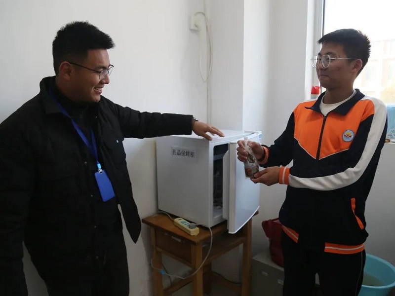 有的同学因生病需要长期服药调理,张杰老师在办公室配备了一台小功率的半导体冰箱,帮助学生冷藏药物;在高三冲刺阶段,学校每天为每一位同学赠送一个“加油蛋”,张杰老师自己准备材料和工具,将“加油蛋”变为更可口的“茶叶蛋”;天气炎热时,一楼的盥洗间使用频繁,异味大,张杰老师将家中多余的管件拿到学校里同维修师傅一同安装了地面清洗管路,方便地面清洁,一件件的小事无不透露出张杰老师在工作中的用心、用情。