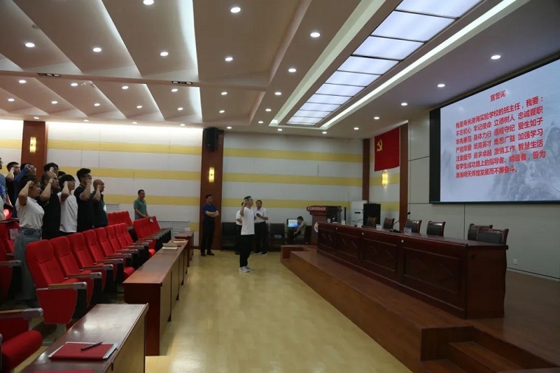 大会第六项,全体班主任宣誓环节。所有参会人员肃然起立,由陈昱强老师领誓,全体班主任庄严宣誓。铮铮誓言响彻全场,表达了老师们满怀信心,带着责任迎接教书育人的使命。